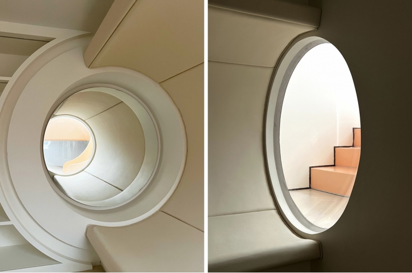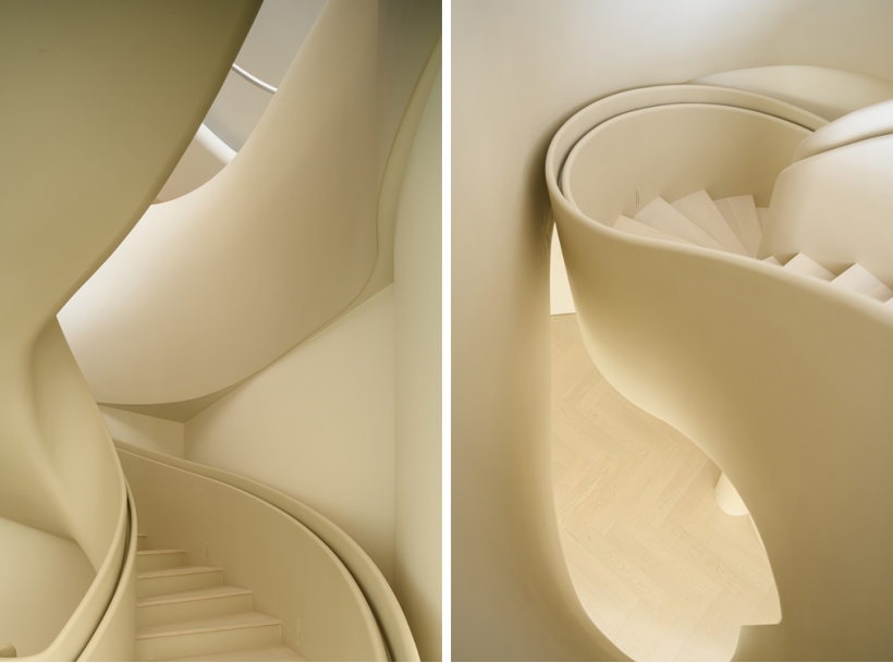 核心處異形旋轉(zhuǎn)樓梯圓潤的弧線輕巧的勾連起上下樓層之間的界限。