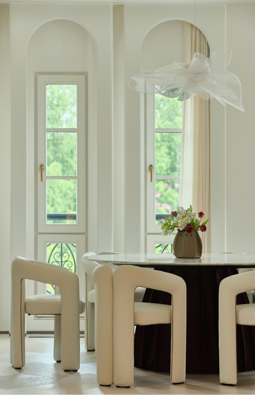 Cassina的Dudet餐椅以柔軟又兼具體量感的外形搭配時尚的AIRNOVA夢露餐桌銜接起客廳與餐廚區(qū)域之間的關系,也將客廳溫潤靈動的底色延續(xù)過來。